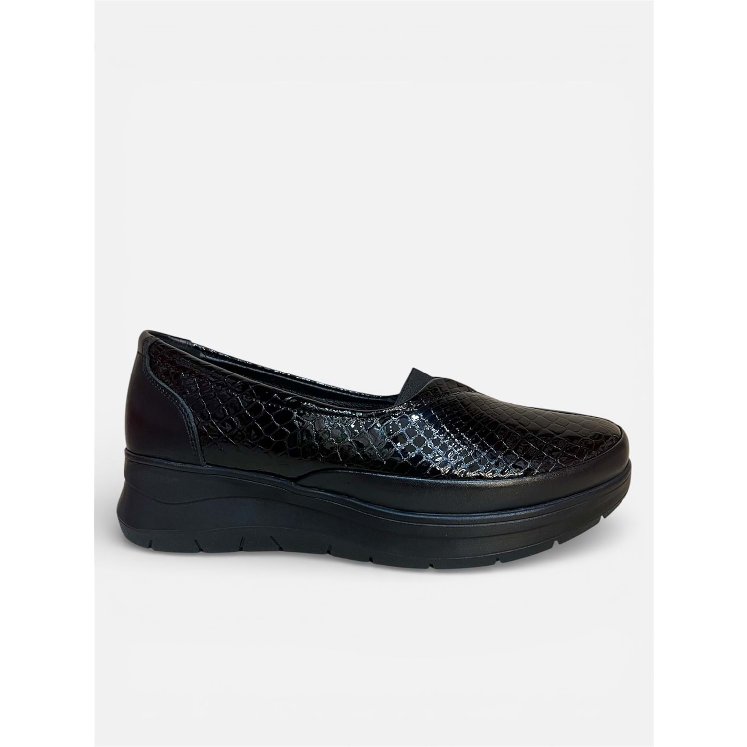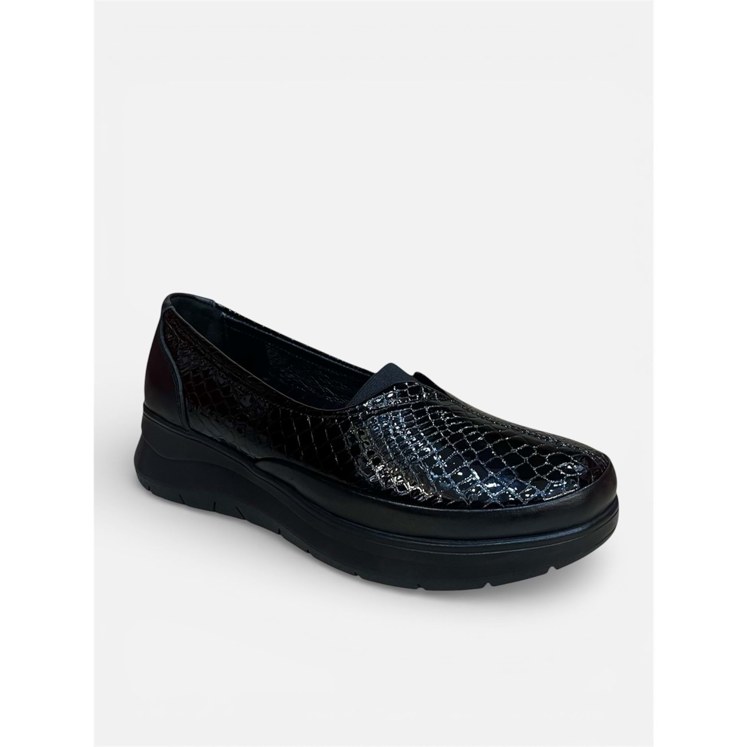 Rugan deri üst yüzey: Parlak, dayanıklı ve kolay temizlenebilir. Gerçek (doğal) deri astar: Ayak içi nefes alabilir, terlemeyi azaltır. Kalın, destekleyici taban: Aşınmaya dayanıklı kauçuk veya poliüretan Ayağın anatomisine uygun taban yapısı: Ayak kemeri, topuk ve ön ayak bölgelerini dengeler. Topuk kavisi ve destekli bilek yardımı: Uzun yürüyüşlerde bile konfor sağlar. Darbe emici orta taban: Yürürken basıncı minimize eder, eklem ve bel ağrılarını azaltır. Ayak parmakları için geniş ön kısım: Sıkışmayı önler, tırnak itişini kolaylaştırır.